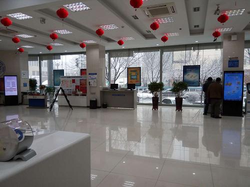 (圖三)大堂兩側(cè)分別安裝了時尚大氣的落地一體機(jī),動態(tài)宣傳著銀行多類業(yè)務(wù)資訊,包括新品、形象宣傳片、重大新聞等,絢麗的頁面,動態(tài)的播放效果,有效吸引客戶的眼球,打造銀行第一推廣窗口。