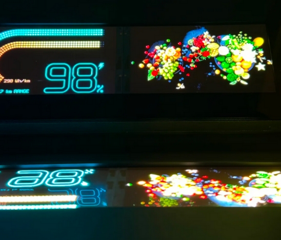 另一款為單色玻璃基Micro LED HUD,像素點(diǎn)間距為58μm,像素密度達(dá)431PPI,峰值亮度可達(dá)30萬nits,可在強(qiáng)光環(huán)境下保持可視性。該方案結(jié)合LTPS高遷移率特性與低電阻材料,提高驅(qū)動能力并降低功耗,配合光學(xué)微結(jié)構(gòu)設(shè)計,實(shí)現(xiàn)亮度提升。